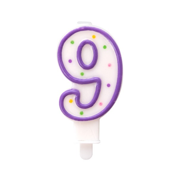 Vela número 9 con detalles de lunares multicolor.