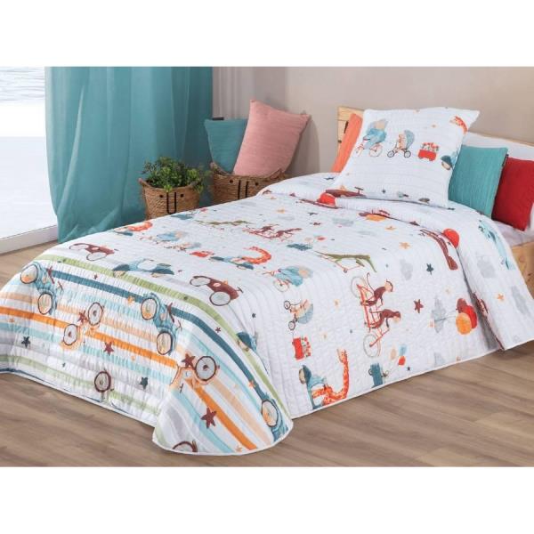 Colcha junior ideal para los meses de primavera-verano para cama de 90 cm con un estampado de animales. Incluye funda de cojín de 50x50 cm. Fabricada con microfibra que le aporta ligereza y transpirabilidad perfecta para las noches calurosas.