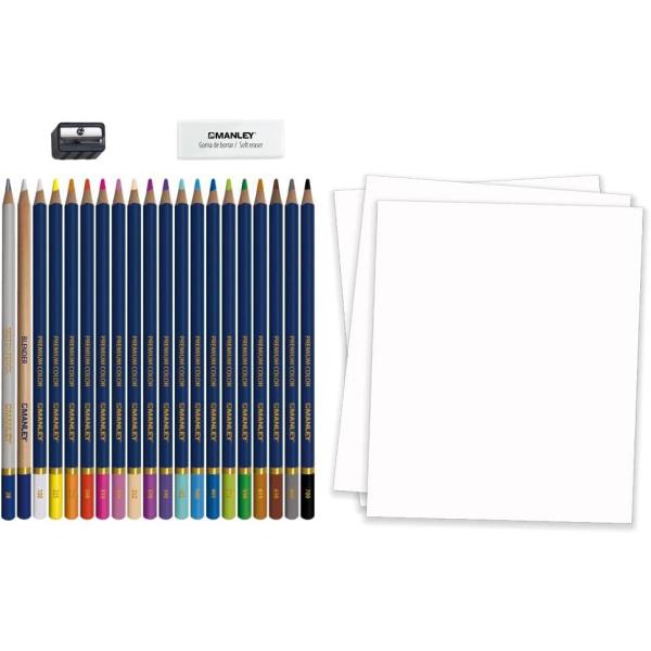 Set Creativo Manley con Lápices de Colores - 23 Piezas, Calidad de Artista Expande tu arsenal creativo con el set creativo Manley, diseñado especialmente para artistas y entusiastas del arte. Este completo kit incluye 18 lápices de colores premium que ofrecen una rica pigmentación y suavidad superior, un lápiz de grafito 2B para bocetos detallados, un blender para mezclar colores con maestría, una goma de borrar sin marcas, y un sacapuntas de alta calidad. Además, el set viene con un práctico bloc de bocetos tamaño A5, perfecto para llevar tus ideas al papel en cualquier lugar. Todo empacado en un elegante estuche, este set es el compañero ideal para todo artista que busca calidad y versatilidad en su trabajo.