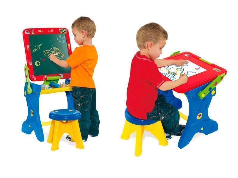 Pupitre con banco y pizarra, 2 en 1. Al levantar el tablero es una pizarra y al bajarlo se convierte en un pupitre con mucha estabilidad. Incluye 10 tizas de colores, 1 borrador, 1 lápiz 1 goma y 1 sacapuntas. Edad indicada + 3 años.