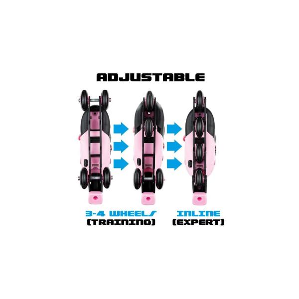 Patines ajustables color rosa para tallas de 34 a 38. Puedes modificar la posición de las ruedas. Edad recomendada +6 años.