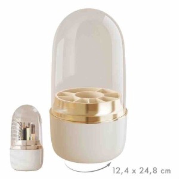 Organizador giratorio para brochas y maquillaje de 12,4 x 24,8 cm con cubierta transparente y compartimentos superiores, perfecto para mantener tus cosméticos visibles, protegidos y ordenados.