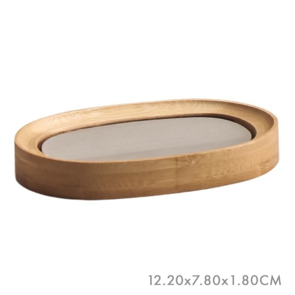 Esta jabonera combina una base de cemento resistente con un borde de bambú cálido, creando un accesorio sofisticado y funcional. Su diseño ovalado mantiene el jabón seco por más tiempo y aporta un toque decorativo moderno y minimalista. Medidas: 12,2 × 7,8 × 1,8 cm.