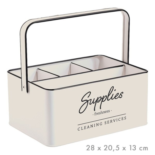 Caja organizadora metálica 28 x 20,5 x 13 cm, con compartimentos internos y asa para transportar fácilmente productos de limpieza u otros accesorios.