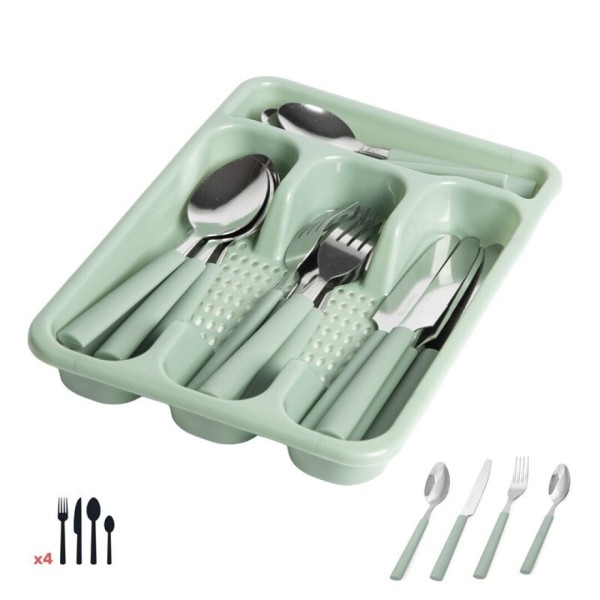 Este práctico set de cubiertos en color verde incluye todo lo necesario para el día a día, acompañado de una bandeja organizadora que mantiene cada pieza en su lugar de forma cómoda y ordenada. Fabricados en acero inoxidable resistente.