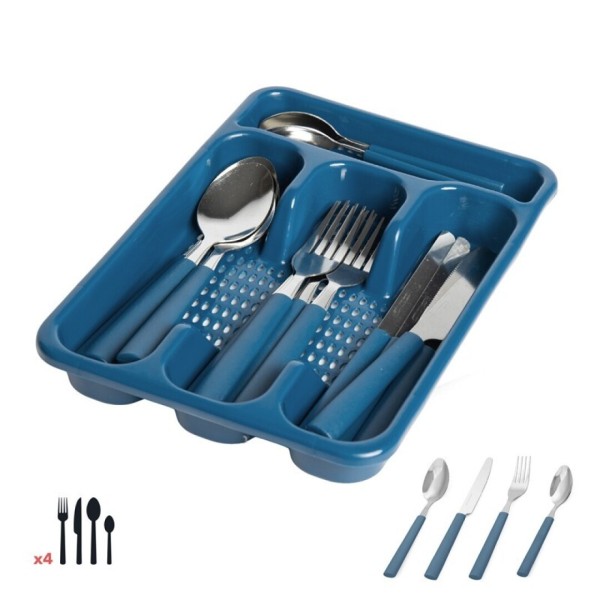 Este práctico set de cubiertos en color azul incluye todo lo necesario para el día a día, acompañado de una bandeja organizadora que mantiene cada pieza en su lugar de forma cómoda y ordenada. Fabricados en acero inoxidable resistente.