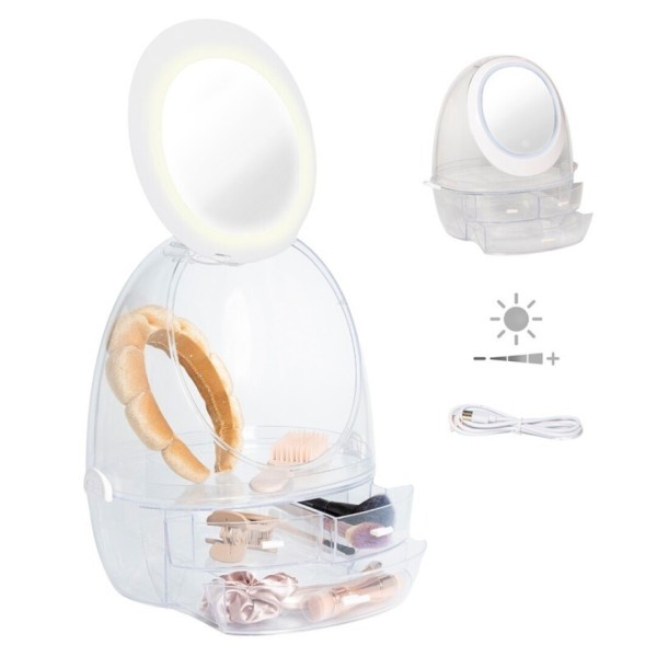Organiza tu tocador con estilo y consigue una iluminación perfecta para tu rutina diaria gracias a este práctico organizador con espejo LED incorporado. Su diseño transparente y moderno permite ver todo de un vistazo, manteniendo tus cosméticos siempre ordenados y accesibles. Medidas: 30 × 20 × 35 cm.
