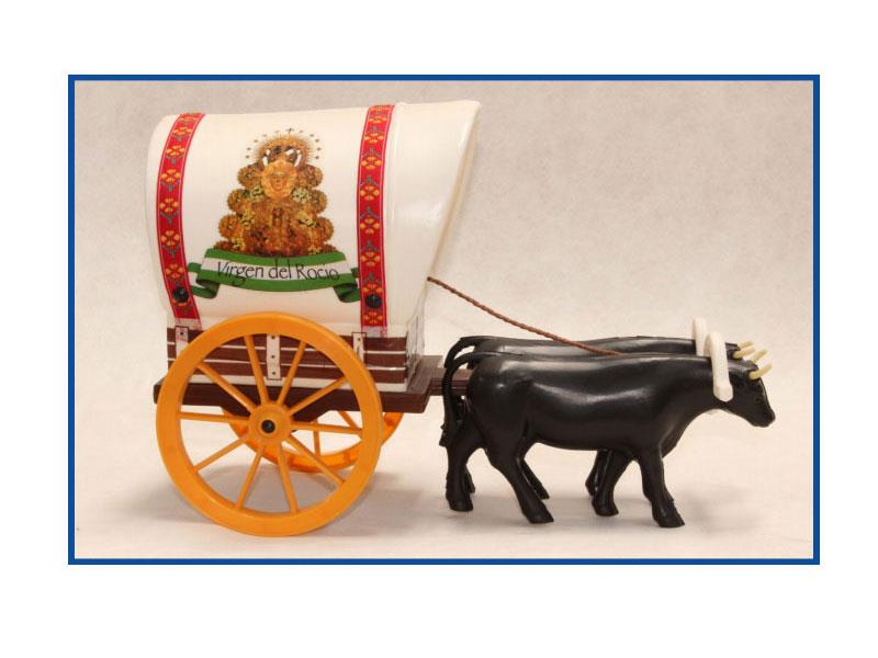 Carroza con vacas de la Virgen del Rocío sin ningún tipo de mecanismo. Tiene unas medidas de 34 x 25 cm y está recomendado a partir de 3 años.