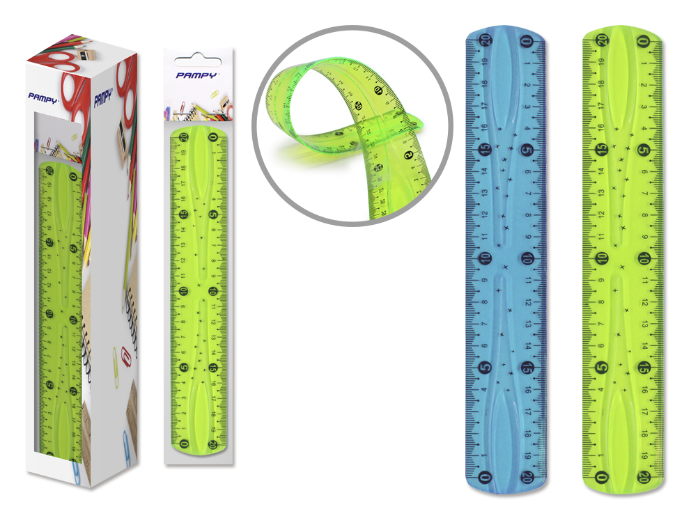 Regla flexible en PVC. Disponible en varios colores. Medida:20cm. Se vende por unidad.
