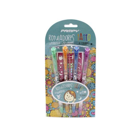 Rotuladores Tattoo con plantillas y brillantes para decorar. El blíster incluye 4 rotuladores de colores diferentes.