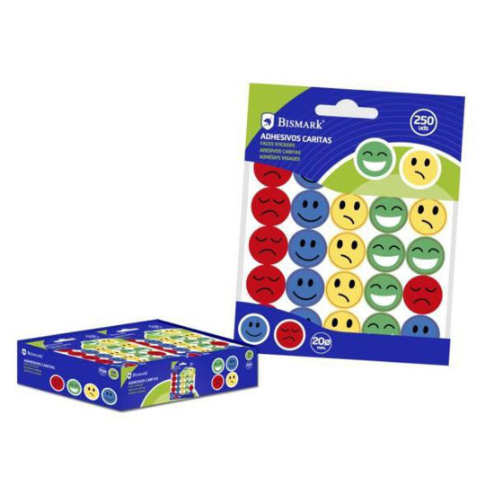 Etiquetas adhesivas circulares con dibujos de caritas de 20 mm de diámetro presentada en blister de 250 unidades.