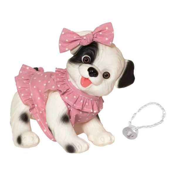 Adorable perrito de 23 cm con vestido rosa de lunares y lazo a juego, perfecto para juegos de cuidado y compañía. A partir de 3 años.