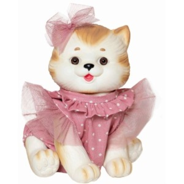Un tierno gatito de 23 cm de vinilo blanco con rayas marrones, vestido con un elegante camisón rosa de tul y topos. Edad recomendada +3 años.