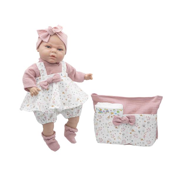 Muñeca Roma de 40 cm con cuerpo blandito y extremidades de vinilo que emite 36 sonidos. Llleva un vestido de flores con camiseta rosa, y patucos a juego. Incluye neceser con un pañal. Edad recomendada +3 años.