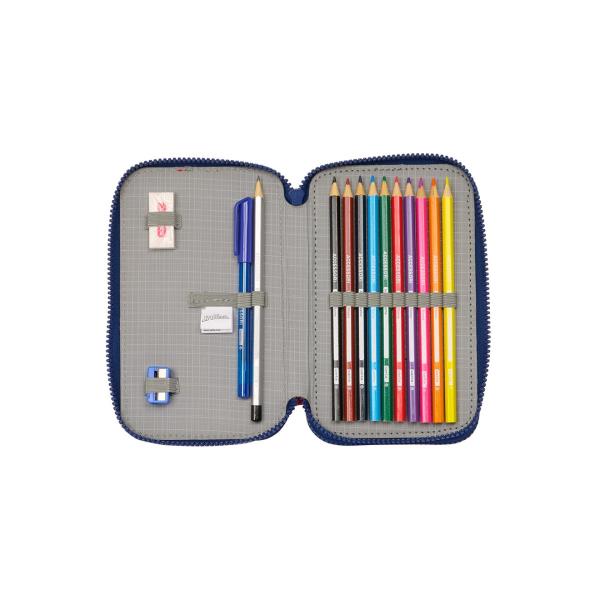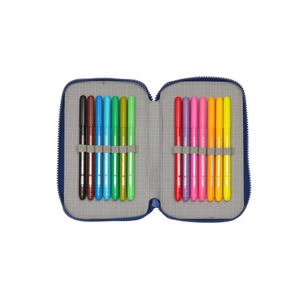 Plumier Spiderman con doble compartimento. Contiene 28 piezas: goma, lápiz de grafito, bolígrafo azul, sacapuntas y 10 colorines de madera (1er compartimento), 14 rotuladores de colores (2º compartimento). Medidas: 19x22 cm.