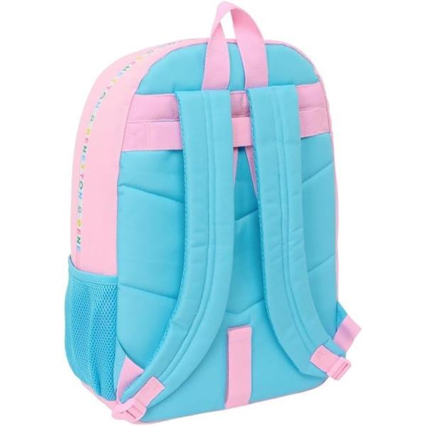 La mochila escolar Benetton combina resistencia y comodidad, ideal para el día a día. Confeccionada en poliéster muy resistente con cremalleras suaves, ofrece durabilidad y practicidad. Cuenta con un bolsillo frontal de gran formato para almacenamiento adicional y doble tirador en las cremalleras principales para facilitar su apertura. Su diseño ergonómico incluye hombreras y espalda acolchadas, garantizando un ajuste cómodo. Además, dispone de un asa de mano en la parte superior y es adaptable a carro portamochilas, brindando mayor versatilidad en su transporte. Medidas: 14x30x46 cm.