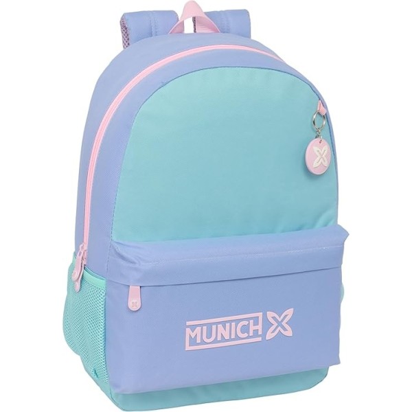 Mochila Munich adaptable a carro portamochilas, ideal para el día a día escolar. Incorpora compartimento principal con doble tirador para una apertura más cómoda, bolsillo frontal con cremallera y bolsillos laterales para botellas o accesorios. Cuenta con hombreras y espalda ergonómicas y acolchadas para mayor confort, además de asa superior reforzada. Medidas: 30x14x46 cm.