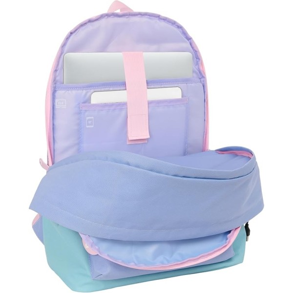 Mochila Munich con diseño moderno y gran capacidad, ideal para colegio, instituto o uso diario. Incorpora alojamiento antirrobo trasero acolchado para portátil de hasta 15,6” y tablet de hasta 11”, conector USB para carga de dispositivos y base acolchada para mayor protección. Cuenta con compartimento principal amplio con doble tirador, bolsillo frontal con cremallera, hombreras y espalda ergonómicas acolchadas y asa superior reforzada. Medidas: 31x18x44 cm.