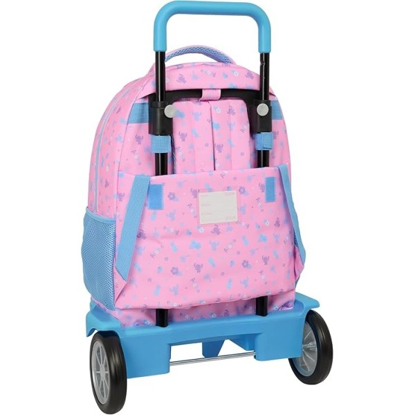 Mochila de Stitch con carro extraíble, fabricada en poliéster de alta resistencia con cremalleras suaves para un uso diario duradero. Dispone de amplio departamento principal, bolsillo frontal de gran formato, bolsillo lateral portabotellas y tarjeta de identificación personal. Incluye bandeja interior de PVC y base reforzada para mayor estabilidad. Cuenta con hombreras y espalda acolchadas, asa superior acolchada y asa extensible con sistema de bloqueo. Carro de polipropileno y acero pintado con ruedas de goma antivibración ultra silenciosas. Medidas mochila: 45x33x22 cm. Altura abierta: 93 cm.