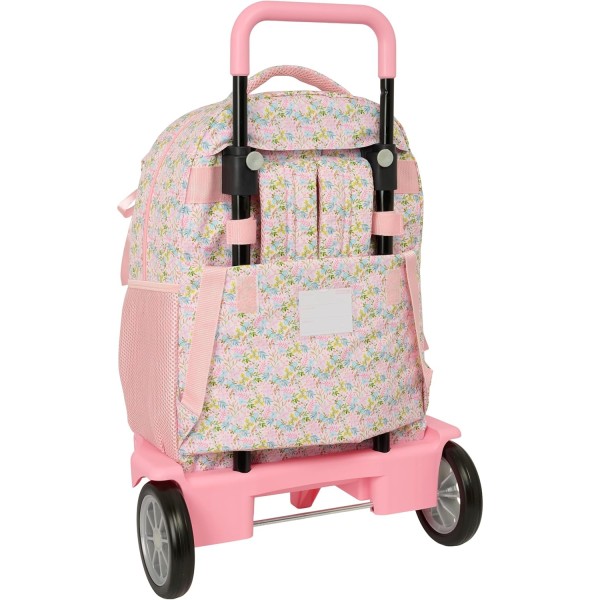 Mochila infantil extraíble confeccionada en poliéster de alta resistencia con cremalleras suaves. Cuenta con amplio compartimento principal, bolsillo frontal de gran formato y bolsillo lateral portabotellas. Incluye tarjeta de identificación personal y bandeja interior de PVC. Dispone de hombreras y espalda acolchadas, asa superior acolchada y sistema de asa extraíble con bloqueo. Carro fabricado en polipropileno y acero pintado, con ruedas de goma antivibración ultrasilenciosas y base reforzada. Medidas mochila: 33x22x45 cm. Altura abierto: 93 cm.