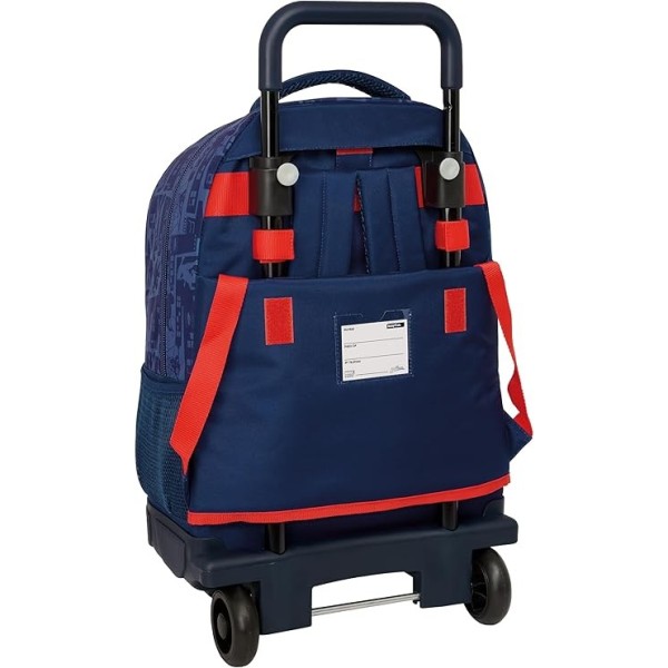 Mochila de Spiderman con carro extraíble, fabricada en poliéster de alta resistencia con cremalleras suaves para un uso diario duradero. Dispone de amplio departamento principal, bolsillo frontal de gran formato, bolsillo lateral portabotellas y tarjeta de identificación personal. Incluye bandeja interior de PVC y base reforzada para mayor estabilidad. Cuenta con hombreras y espalda acolchadas, asa superior acolchada y asa extensible con sistema de bloqueo. Carro de polipropileno y acero pintado con ruedas de goma antivibración ultra silenciosas. Medidas mochila: 45x33x22 cm. Altura abierta: 93 cm.