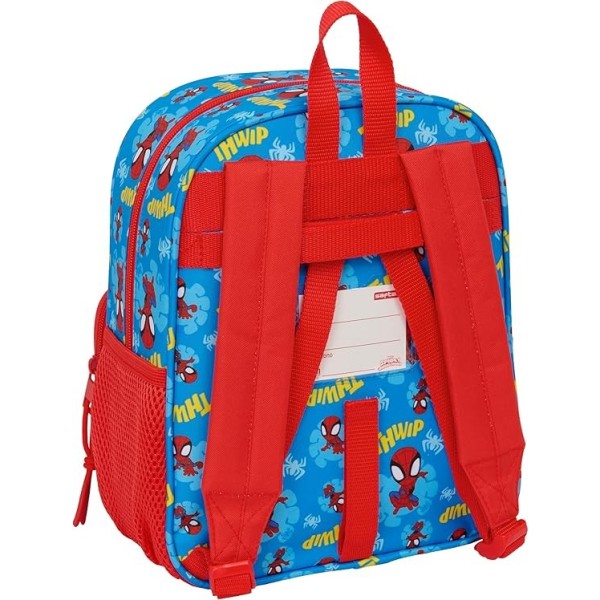 Mochila escolar infantil de Spidey con diseño colorido y divertido. Fabricada en poliéster resistente con cremalleras suaves, cuenta con bolsillo frontal de gran formato y bolsillo lateral portabotellas. Incorpora hombreras ergonómicas y acolchadas para mayor comodidad, asa de mano superior y sistema adaptable a carrito portamochilas Safta. Medidas: 28x10x34 cm.
