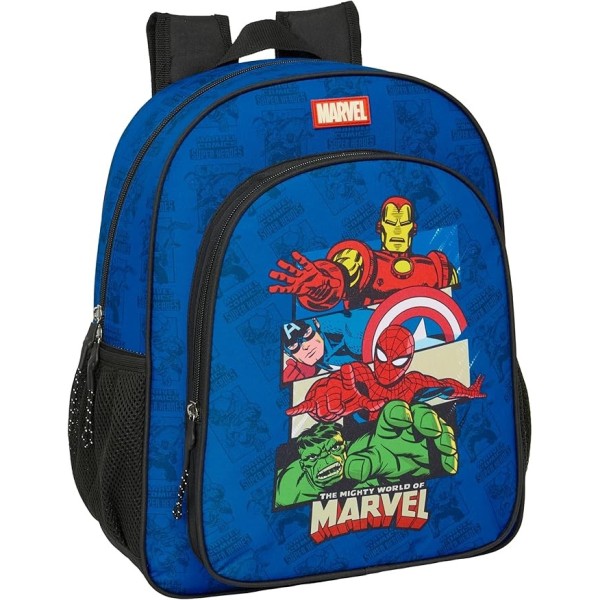 Mochila escolar junior Avengers adaptable a carro portamochilas, confeccionada en poliéster de alta resistencia con cremalleras suaves para un uso diario cómodo y duradero. Dispone de bolsillo frontal de gran formato y bolsillos laterales portabotellas para una organización práctica. Incorpora espalda y hombreras acolchadas, ergonómicas, cómodas y ajustables, además de asa superior de mano para facilitar el transporte. Medidas: 38x32x12 cm.