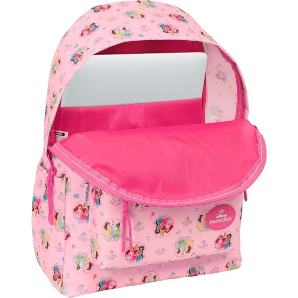 Mochila de las Princesas Disney confeccionada en poliéster de alta resistencia con cremalleras suaves y duraderas. Incorpora alojamiento acolchado para portátil de hasta 14,1”, bolsillo interior con cremallera y bolsillos laterales portabotellas para mayor organización. Cuenta con bolsillo frontal con cremallera y hombreras, espalda y base acolchadas para máxima comodidad y protección. Asa superior reforzada. Medidas: 31x13x43 cm.