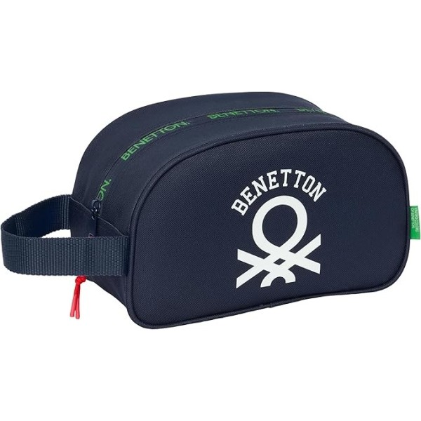 Neceser Benetton confeccionado en poliéster de alta resistencia con cremalleras suaves, ideal para colegio, gimnasio o viajes. Cuenta con amplio compartimento principal, asa de mano lateral para mayor comodidad y sistema adaptable a carro portamochilas. Medidas: 26x12x15 cm.