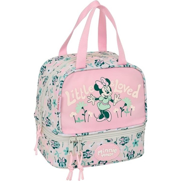 Portameriendas infantil de Minnie Mouse fabricado en poliéster resistente con cremalleras suaves. Dispone de compartimento principal superior y compartimento inferior independiente en la base para una mejor organización. Incluye doble asa de mano y tarjeta de identificación personal. Medidas: 20x15x20 cm.