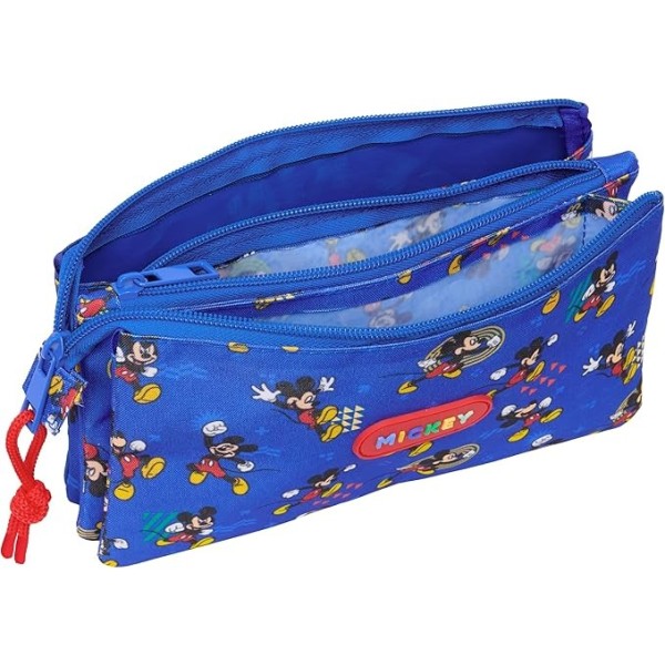 Portatodo de Mickey con 3 compartimentos independientes con cremallera para mantener bolígrafos, lápices y accesorios perfectamente organizados. Incluye bolsillo interior central con cierre para mayor seguridad. Fabricado en material resistente y duradero. Medidas: 22x3x12 cm.