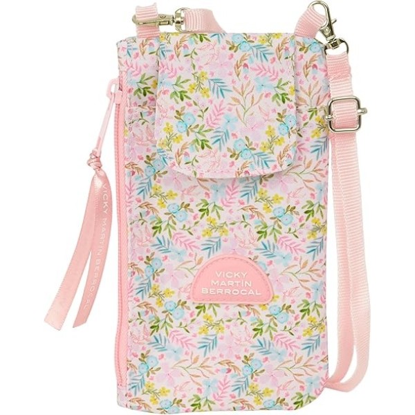 Portamóvil Vicky Martín Berrocal confeccionado en poliéster de alta resistencia con cremalleras suaves. Dispone de alojamiento para teléfono móvil de hasta 6,9 pulgadas y compartimento independiente con cremallera para monedas u objetos pequeños. Incluye cordón ajustable para llevar colgado con total comodidad. Medidas: 19x10 cm.
