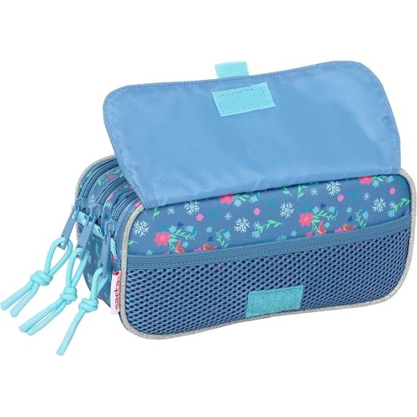 Portatodo triple de Frozen fabricado en poliéster resistente con cremalleras suaves. Dispone de tres compartimentos independientes con cierre de cremallera para una organización perfecta, además de bolsillo frontal con cremallera y asa lateral de mano. Incluye cinta trasera adaptable a carro portamochilas. Medidas: 21,5x8x10 cm.