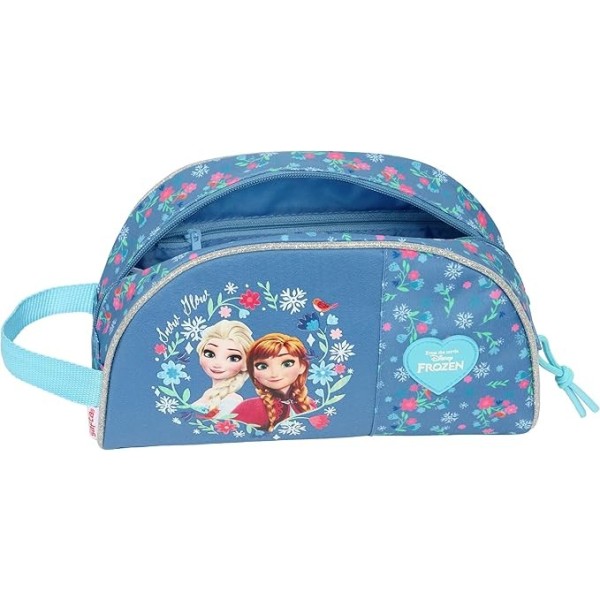 Neceser de Frozen confeccionado en poliéster de alta resistencia con cremalleras suaves, ideal para el uso diario. Cuenta con compartimento principal amplio y bolsillo interior con cremallera para mantener tus accesorios bien organizados. Incluye cinta trasera adaptable a carro portamochilas para mayor comodidad en el transporte. Medidas: 26x16x9 cm.