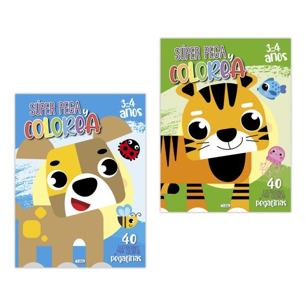 Los libros Súper Pega y Colorea están diseñados especialmente para niños de 3 a 4 años, con ilustraciones grandes, sencillas y llenas de color. Cada página invita a completar la escena con pegatinas y después colorearla, favoreciendo la creatividad y el aprendizaje temprano.