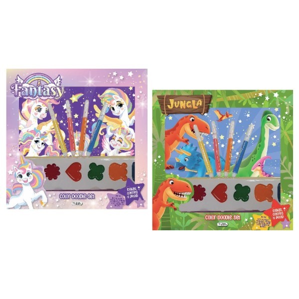 Este set combina plantillas, colores y creatividad para que los niños puedan dibujar, estampar y colorear sin límites.