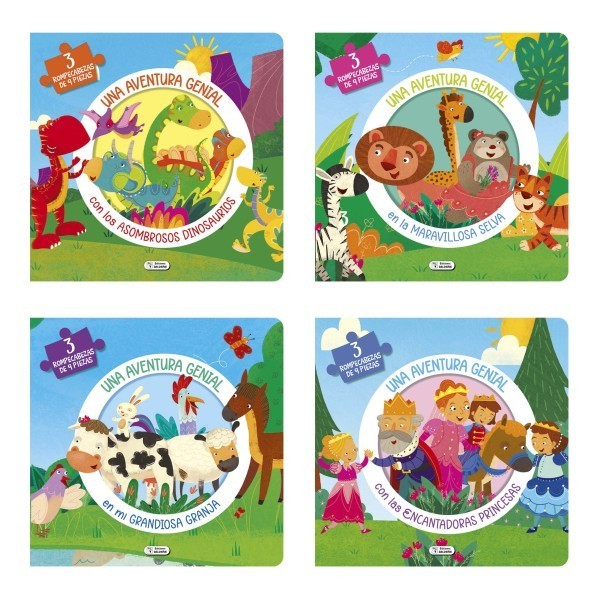 Estos libros combinan cuentos ilustrados con rompecabezas de piezas grandes. Cada libro invita a vivir una nueva aventura en mundos llenos de color: dinosaurios, la selva, la granja o cuentos de princesas.