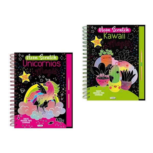 Cuaderno creativo con láminas para rascar que revelan espectaculares colores neón ocultos, incluyendo dulces historias para completar y fomentando la imaginación, la creatividad y el entretenimiento artístico.