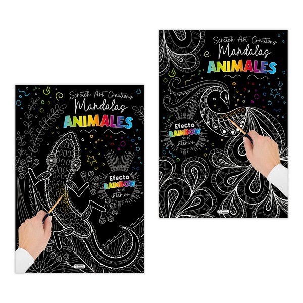 Creativo libro de láminas para rascar que revela un espectacular efecto arcoíris en su interior, permitiendo descubrir y colorear mandalas de animales mientras se fomenta la relajación, la concentración y la creatividad.