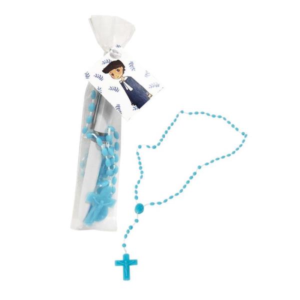 Set bolígrafo con rosario Primera Comunión niño en bolsita de organza.