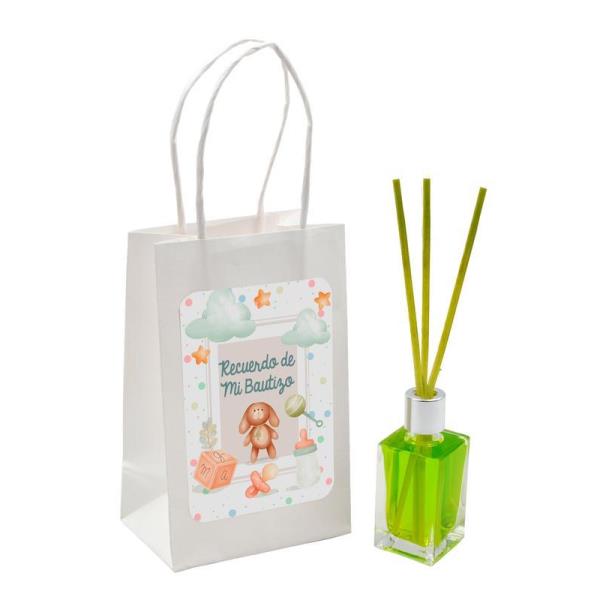 Ambientador mikado con fragancia a manzana en bolsita, para detalle de bautizo. Envase de 15 ml.