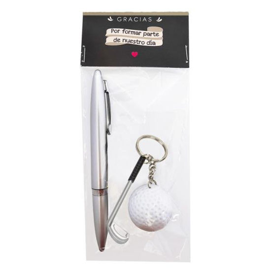 Pack bolígrafo color plata y llavero diseño palo de golf.