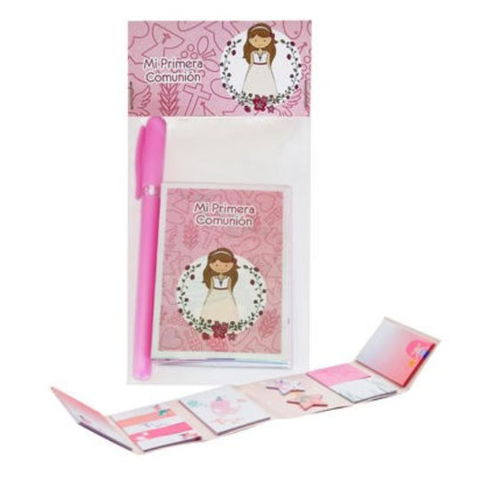 Pack de post-it y bolígrafo rosa para niña de comunión, un set práctico y encantador para recordar el gran día. Perfecto como regalo o detalle para celebrar esta ocasión especial.