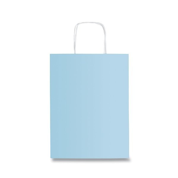 Bolsa de regalo en color azul pastel, fabricada en papel resistente con asas trenzadas para un transporte cómodo y seguro. Medidas: 22 x 10 x 27 cm.