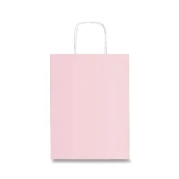 Bolsa de regalo en color rosa pastel, fabricada en papel resistente con asas trenzadas para un transporte cómodo y seguro. Medidas: 22 x 10 x 27 cm.