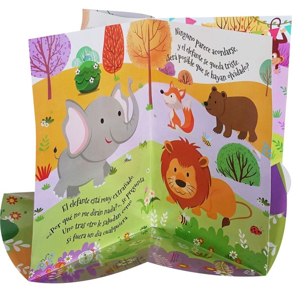 Este libro infantil abre en formato acordeón creando un divertido escenario en 3D, con coloridas ilustraciones de animales.