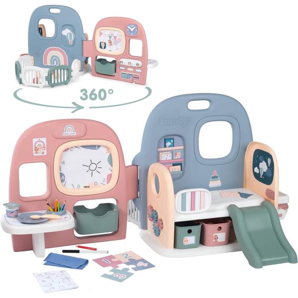 Guardería para muñecos de hasta 42 cm con diferentes áreas de juego y se puede jugar con ellas en un entorno de 360º. Gracias al mecanismo de plegado y al asa de transporte, puede plegarse cómodamente y guardarse fácilmente cuando termina el tiempo de juego. Edad recomendada +3 años. Medidas: 108x78x51 cm.