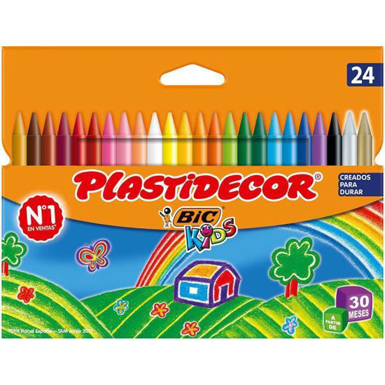 Caja con 24 ceras Plastidecor. Barritas plástica, limpia y resistentes. Se pueden afilar y borrar. Ideal para niños mayores de 2 años.