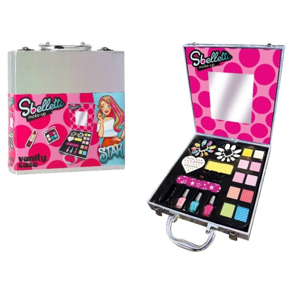 Set de belleza infantil incluye todo lo necesario para dejar volar la imaginación: sombras, pintauñas, brillos, accesorios y mucho más. Viene en un elegante maletín metálico con espejo integrado, ideal para llevar a todas partes.
