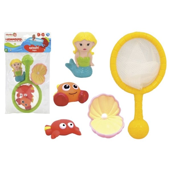 Este set convierte el baño en una aventura marina llena de diversión. Incluye una simpática sirenita, un cangrejo, un pez, una concha con perla y una red para atrapar juguetes